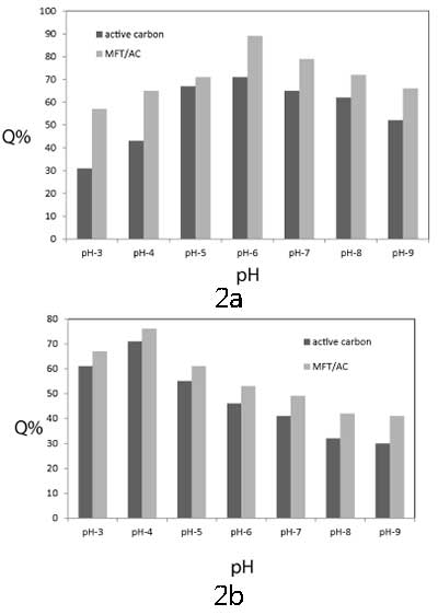 初始pH的影響:初始pH對鉻和鋅離子的去除效率的影響在pH(3-9)的范圍內進行研究,并在(圖2a和2b)中表示。通過在含有50mL初始濃度為100mg / L的50mL重金屬溶液的燒杯中,將0.05g MFT/活性炭或活性炭浸泡在25℃下,并且以210KHz聲強度,以7.7W /厘米1小時。如圖2所示,由于pH影響金屬離子和MFT官能團的化學性質,MFT / 活性炭從水溶液中去除中的金屬離子是pH依賴性過程。在所有pH值范圍內,MFT / 活性炭的去除系數大于活性炭的去除系數。對于鉻離子,去除Cr 3+的系數離子從pH3增加到6,在pH6達到最大值。在pH = 6時,約91%的鉻離子從溶液中去除。在pH范圍(7 - 9),去除系數略有下降。對于鋅離子,去除系數在pH4時達到最大值,鋅離子去除率達到74%,然后明顯下降。在中性或微酸性介質中,吸收可能是由于樹脂 - 金屬離子絡合物的穩定形成,由于配位羧酸根釋放H+,可能導致介質酸度增加。在較高的pH值下,重金屬離子將水解成Cr(OH)+和Zn(OH)+,因此,重金屬正電荷減少到+1,這使得與螯合劑的低相互作用除了金屬氫氧化物可以沉淀。