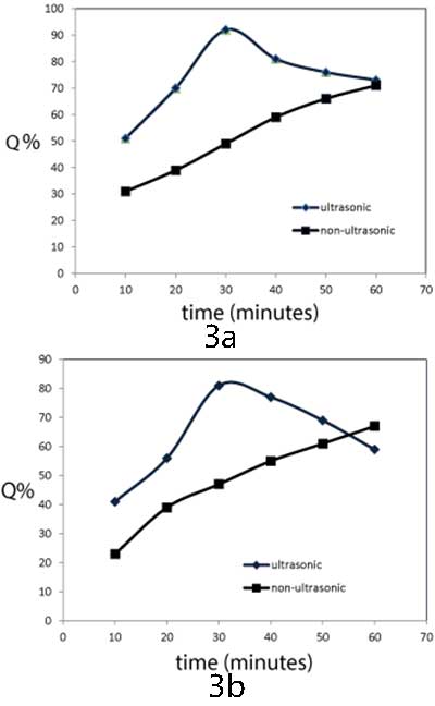 在沒有超聲波的情況下,MFT / 活性炭對兩種重金屬的去除系數隨著去除時間的增加而連續增加,并且在去除過程60分鐘后,大約71%的Cr離子和60%的Zn離子被去除。當超聲波在除去過程中使用時,對于兩種重金屬,去除系數隨著超聲處理時間的增加而增加,在0-30分鐘范圍內,對于鉻離子為92%,對于鋅離子為81%,參見(圖3a和圖3b)圖3b)。在超聲處理(40-60分鐘),去除系數大大變得相當于非超聲波解決方案(鉻)和低于非聲波解決方案(鋅)獲得的。在較早的超聲波處理時間內,借助超聲波減壓,MFT與重金屬的配位作用增強。而隨后的超聲處理時間(從30-60分鐘),由于超聲波的劇烈效應,溶液中產生的高壓和高溫可降低MFT的粒徑。這減少了金屬離子和MFT之間已經形成的螯合鍵的可能的螯合和破壞,MFT負責減少重金屬離子的去除。