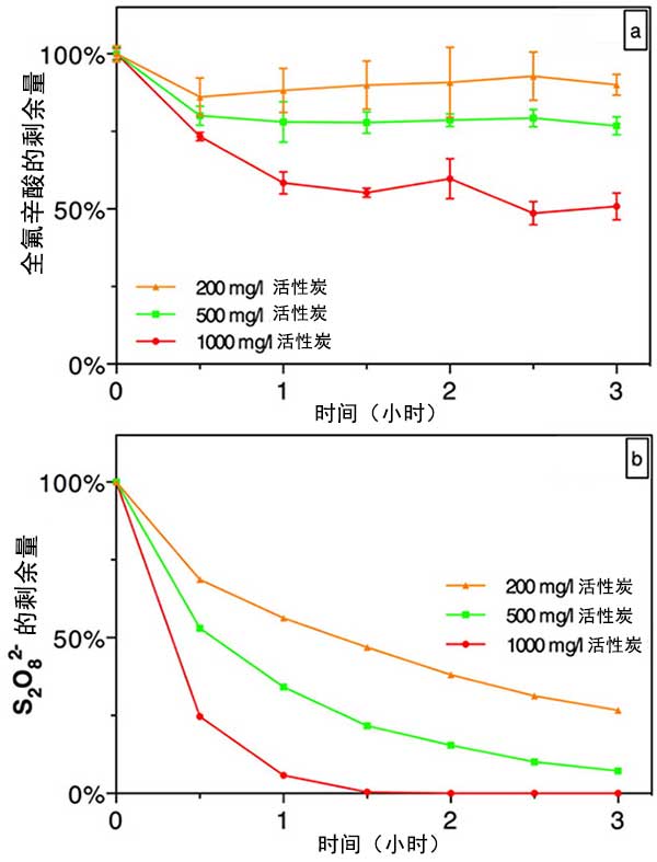 圖2�;钚蕴繚舛葘瘜W吸附去除全氟辛酸(圖2a)和過硫酸鹽分解(圖2b)的影響。